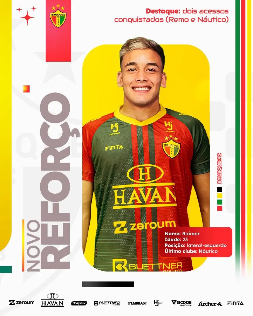 O Brusque FC SAF oficializou nesta segunda-feira (1º) a contratação do lateral-esquerdo Raimar, terceiro reforço anunciado pelo clube para a próxima temporada. O jogador, de 23 anos, chega para integrar o elenco que disputará o Campeonato Catarinense e a Série C do Brasileiro em 2026.