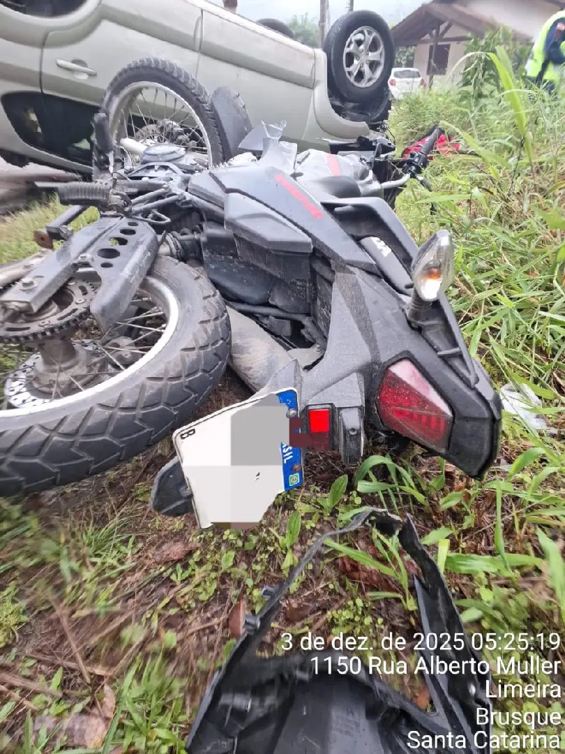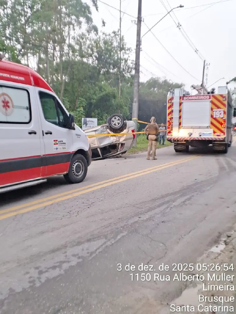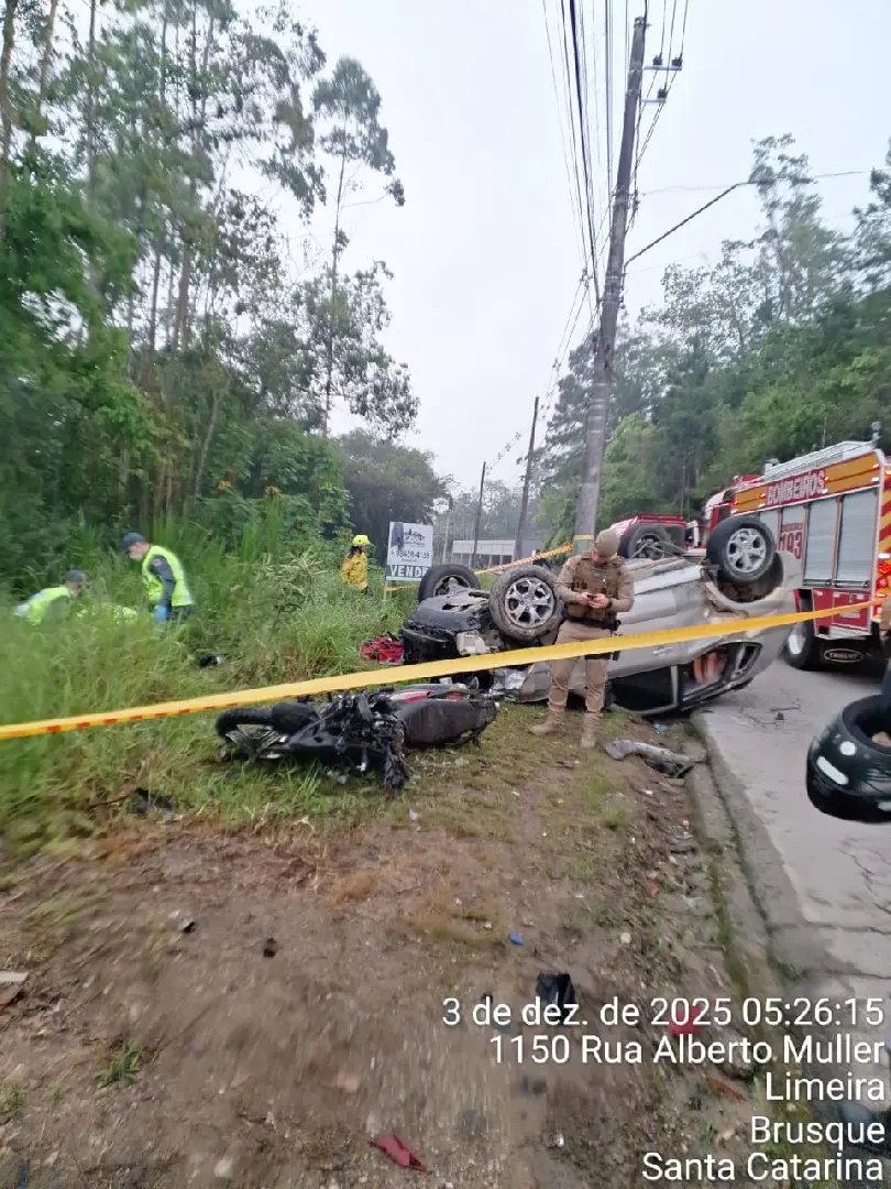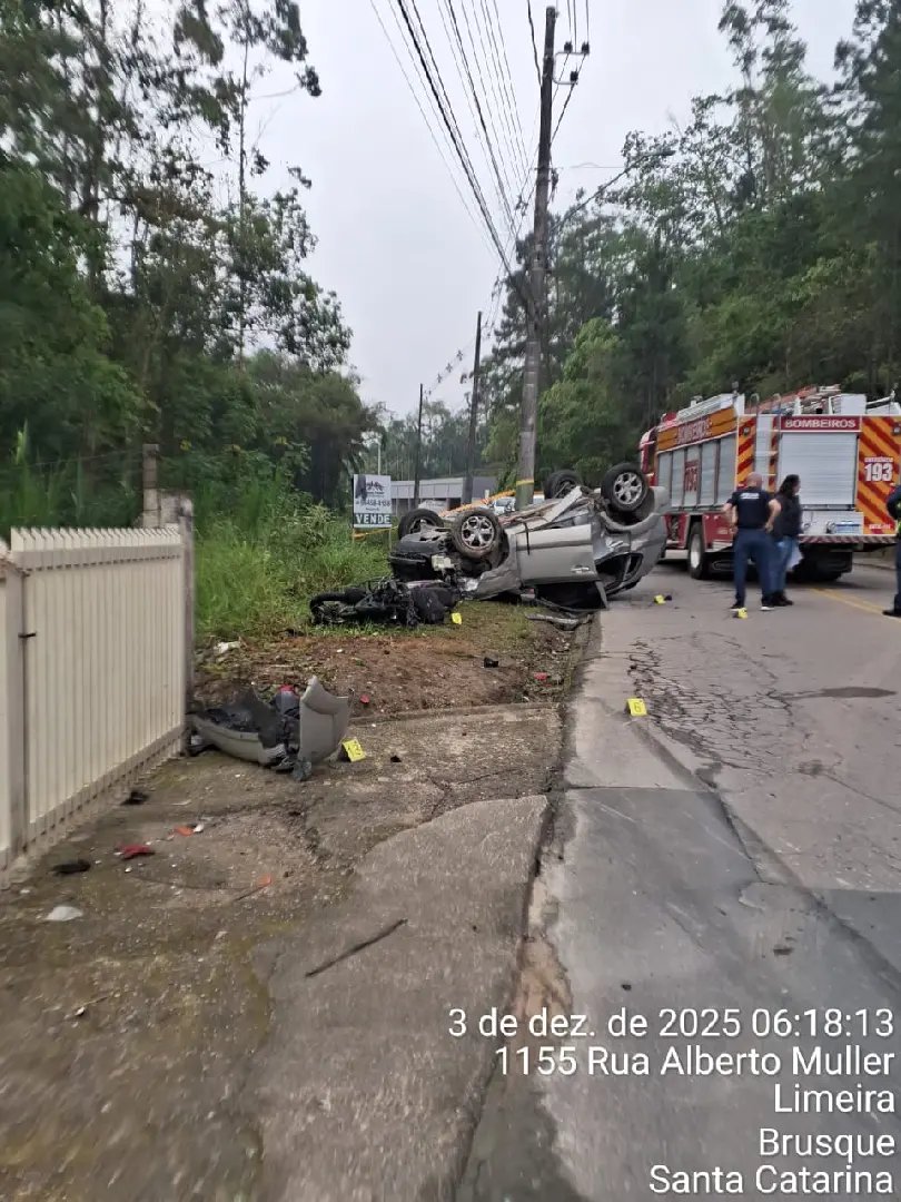 Um grave acidente de trânsito mobilizou equipes do Corpo de Bombeiros e do Samu na madrugada desta quarta-feira (3), na rua Alberto Müller, no bairro Limeira, em Brusque. A ocorrência foi registrada por volta das 4h48 e envolveu um carro e duas motocicletas, resultando em uma morte e dois feridos.