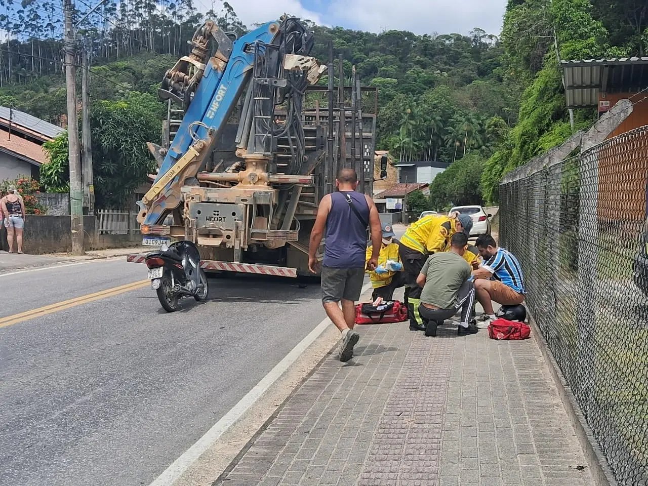 Um motociclista de 37 anos ficou ferido na manhã desta segunda-feira (8) após colidir na traseira de um caminhão na rua Arnoldo Ristow, no bairro Zantão, em Brusque. O impacto ocorreu quando o veículo de carga, do tipo truck que transporta toras de madeira, seguia sentido Centro–bairro e o condutor da Honda Biz preta acabou atingindo a parte traseira do caminhão.
