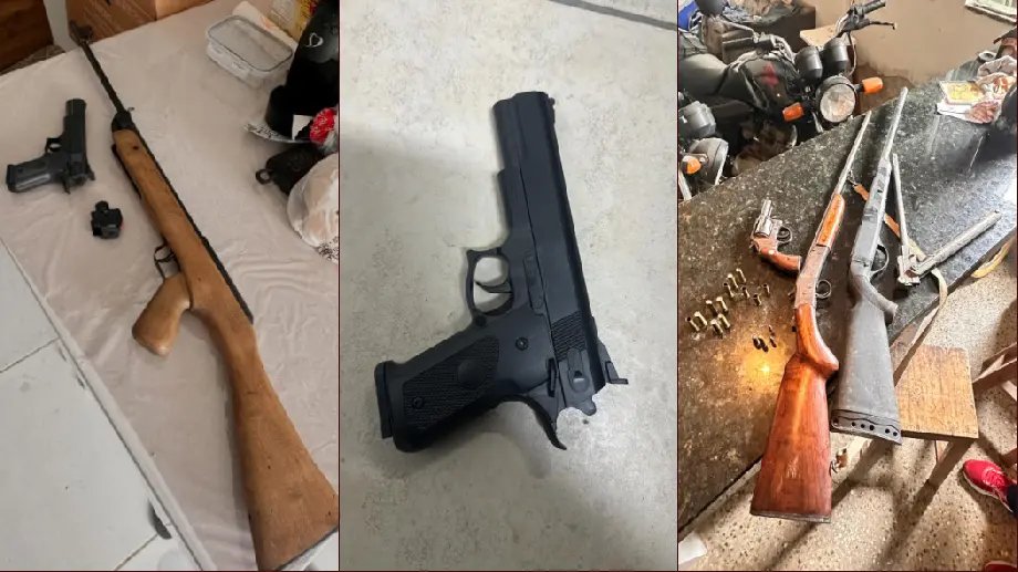 Conforme a Polícia, em uma das residências, no bairro Limeira, as buscas foram acompanhadas pelo morador e resultaram na apreensão de um simulacro de arma de fogo. Em outro endereço, também no bairro Limeira, as buscas foram acompanhadas pelo morador, mas nada de ilícito foi encontrado. Em uma terceira residência, no bairro Rio Branco, as buscas, acompanhadas pelo morador, resultaram na apreensão de uma espingarda calibre 40 e um revólver calibre 38 Special com numeração suprimida, motivo que o morador foi preso em flagrante, pelo crime previsto no Estatuto do Desarmamento, que pode chegar a 6 anos de prisão. O homem foi encaminhado para o presídio porque neste caso não é possível fiança na fase policial. Além disso, foram apreendidos 16 munições e estojos de calibres diversos, mais um simulacro de espingarda e um cano de espingarda calibre 22.