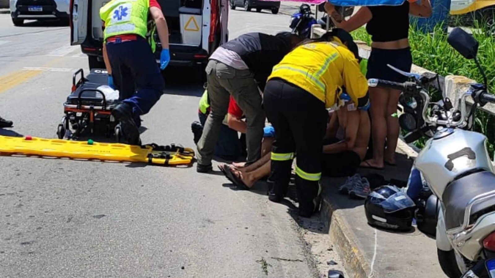 No local, os bombeiros encontraram duas vítimas, ambas já sem capacete. A adolescente estava consciente e orientada, com sinais vitais normais, apresentando suspeita de fratura no punho esquerdo e escoriações nos membros superiores. O jovem, também consciente e orientado, apresentava escoriações nos membros superiores e inferiores, igualmente com sinais vitais estáveis.