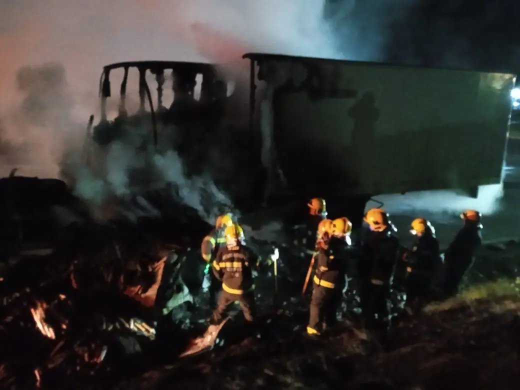 Segundo o Corpo de Bombeiros, as vítimas estavam no automóvel, que bateu na lateral de uma carreta que transportava linguiça calabresa. Com o impacto, os dois veículos foram tomados pelas chamas.