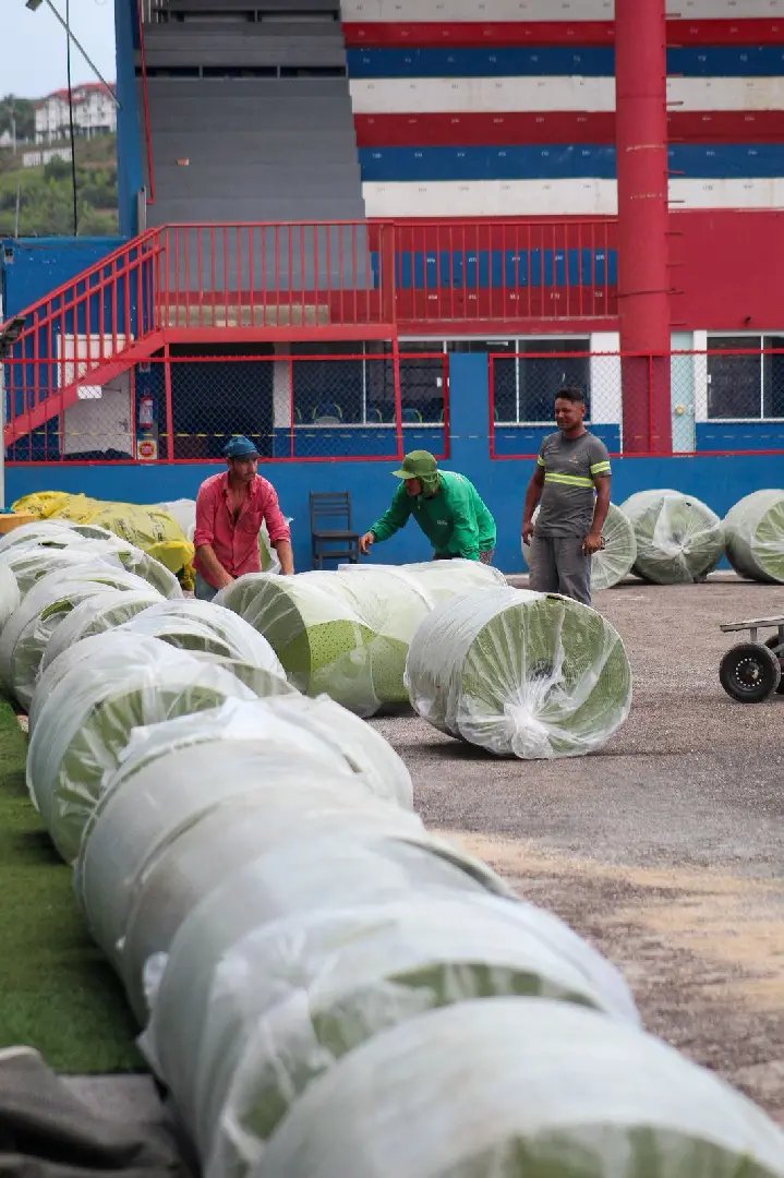 O novo gramado sintético chegou na tarde desta terça-feira (23) ao Estádio Augusto Bauer. O material será instalado nos próximos dias e o clube já trabalha na preparação do campo para receber a nova estrutura.