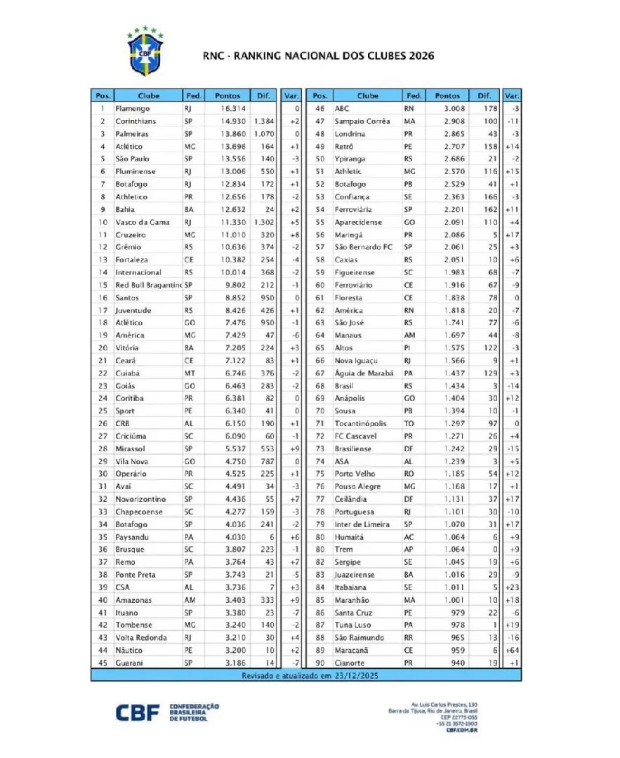 No topo do ranking, não houve mudanças significativas. O Flamengo lidera a lista pelo sexto ano consecutivo, seguido por Corinthians, Palmeiras, Atlético Mineiro e São Paulo, que completam o Top 5 nacional.