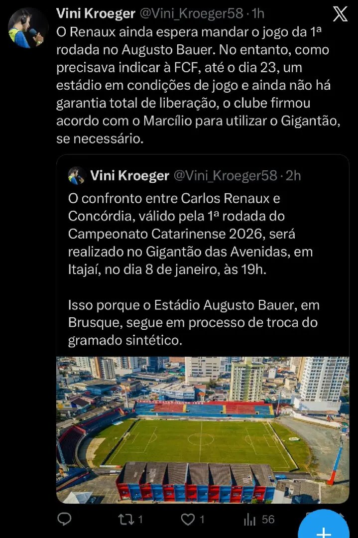 A escolha do estádio foi compartilhada nas redes sociais pelo repórter Vini Kroeger, da Web Catarina, que explicou que o Gigantão foi indicado como plano B exclusivamente para atender ao pedido formal da federação, reforçando o planejamento do clube para iniciar a competição sem imprevistos logísticos.