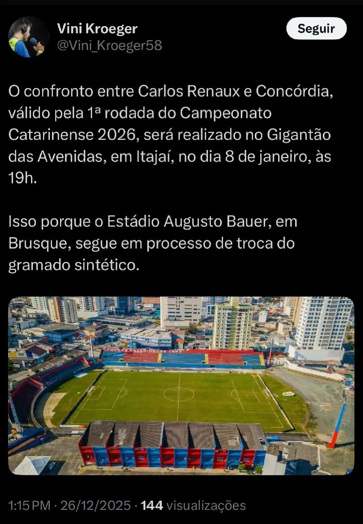 O Carlos Renaux indicou o Estádio Gigantão das Avenidas, em Itajaí, como opção alternativa para mandar sua estreia no Campeonato Catarinense 2026, atendendo a uma solicitação da Federação Catarinense de Futebol (FCF). A federação pediu que os clubes informassem, até o dia 23 de dezembro, onde jogariam suas partidas iniciais do estadual.