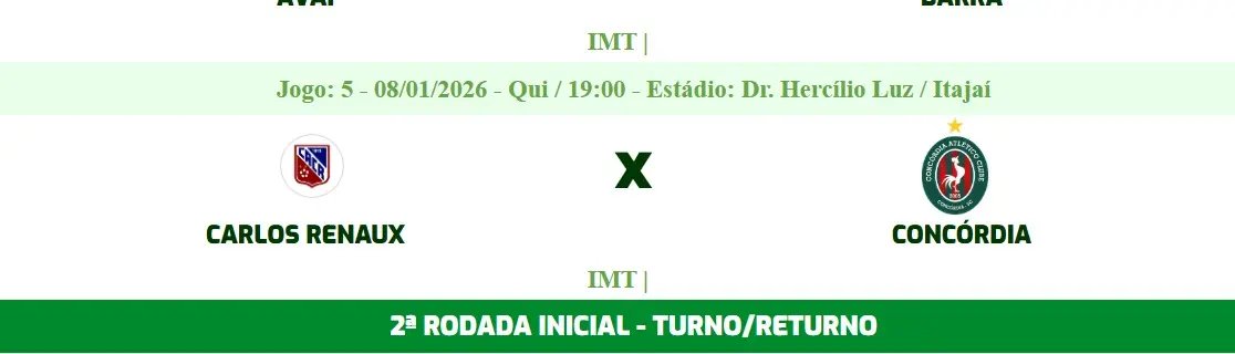 O confronto entre Carlos Renaux e Concórdia, pela 1ª rodada do Catarinense 2026, está marcado para o dia 8 de janeiro, às 19h, no Gigantão das Avenidas, conforme informações divulgadas no site da FCF.