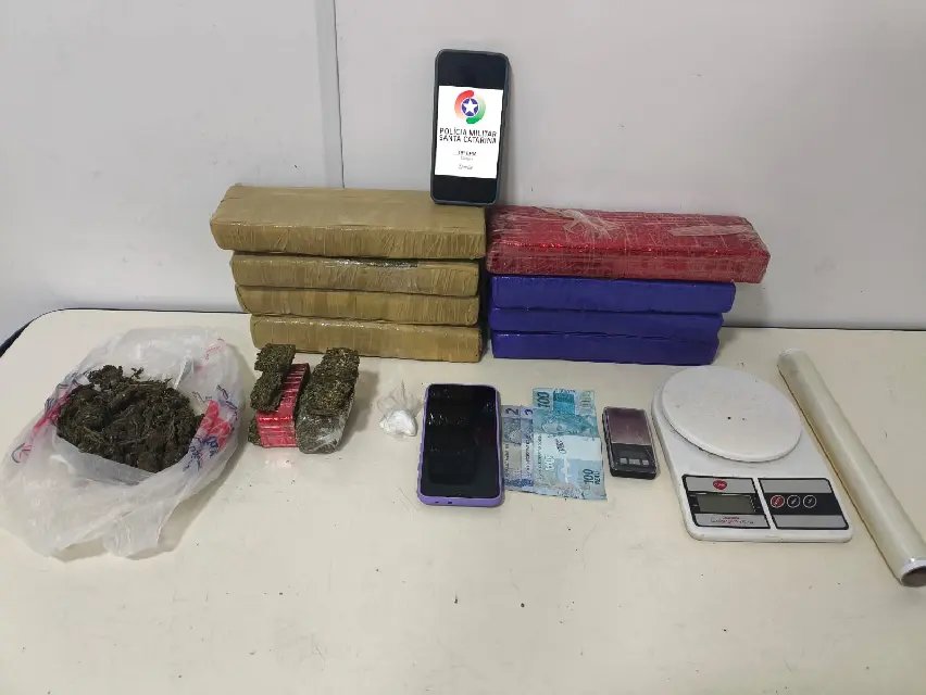 No local, foram apreendidos aproximadamente 5,849 quilos de maconha, 8,27 gramas de cocaína, um aparelho celular, duas balanças de precisão, um rolo de plástico filme e R$ 104 em dinheiro.