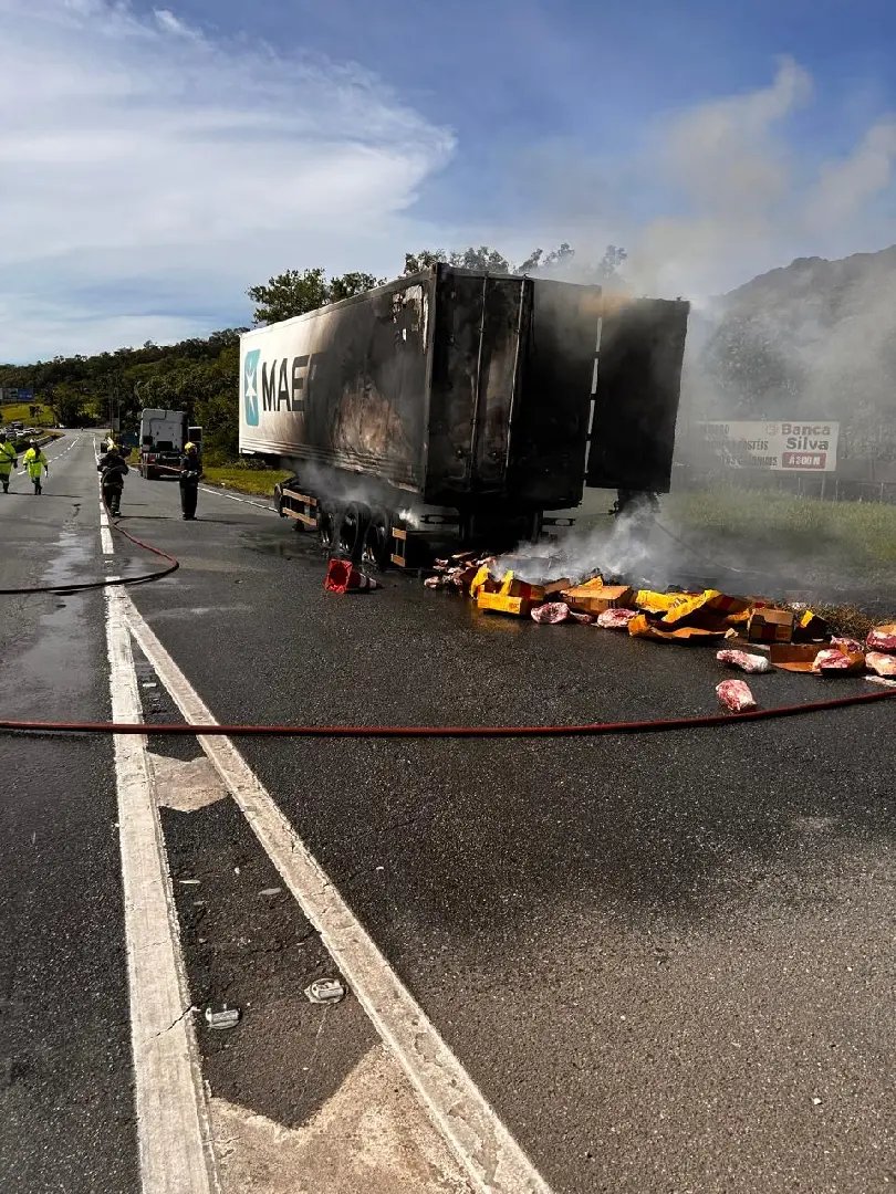 Um incêndio em uma carreta mobilizou o Corpo de Bombeiros na manhã deste domingo (28) na BR-101, em Garuva. O veículo, que transportava carga refrigerada de carne, pegou fogo nas proximidades da praça de pedágio.