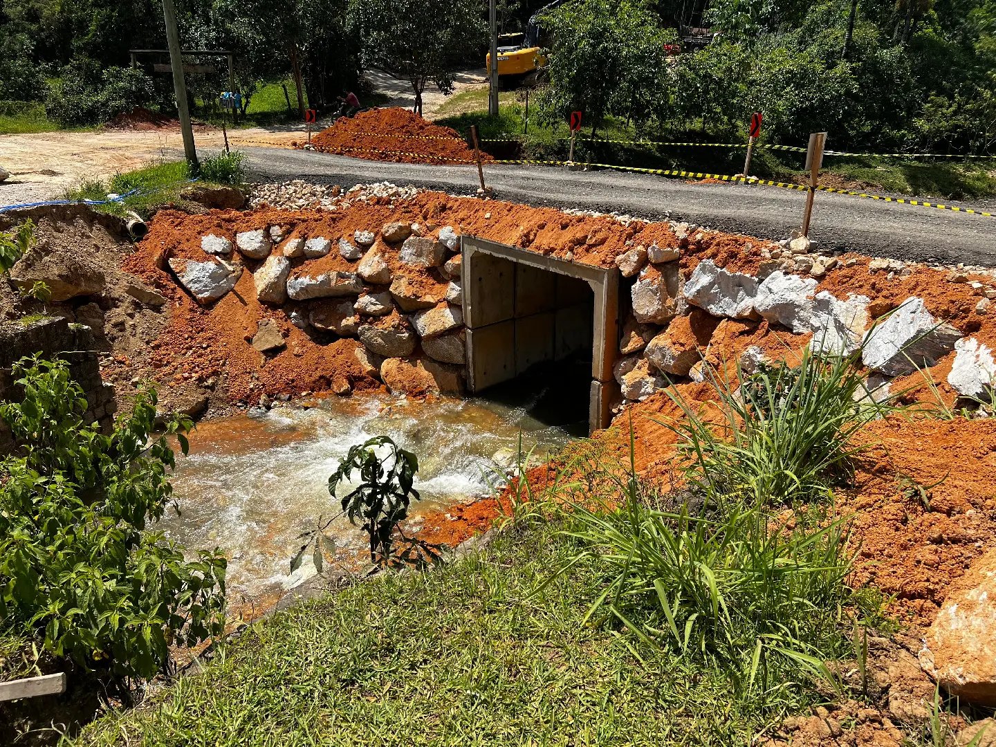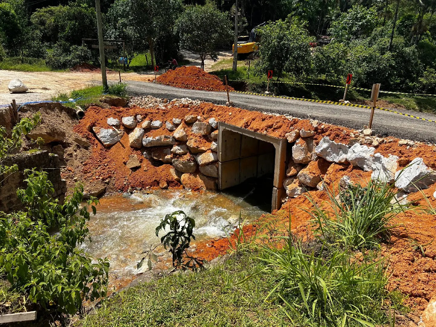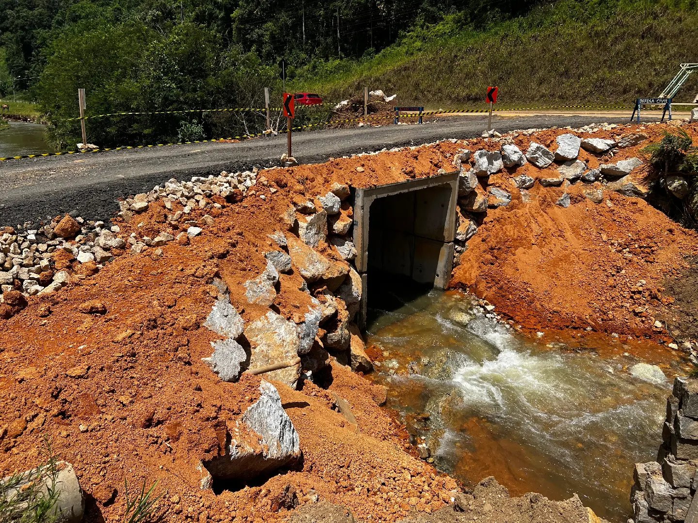 Como medida imediata, foi implantada uma passagem provisória no local, utilizando seis galerias de concreto com dimensões de 3x3 metros. A estrutura recebeu obras de contenção com enrocamento nas duas cabeceiras, empregando pedra bruta detonada, rachão e material de aterro, garantindo a estabilidade do acesso.