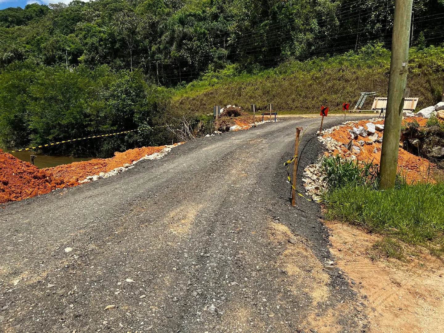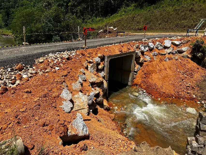 Os trabalhos seguem em andamento com a realização de acabamentos no local. Na sequência, será iniciada a construção do enrocamento argamassado nas cabeceiras onde a ponte de madeira foi danificada. O local receberá, posteriormente, uma ponte de concreto definitiva, em modelo similar ao implantado na rua Alberto Pretti, com estrutura disponibilizada pela Defesa Civil do Estado de Santa Catarina, garantindo uma solução permanente para a travessia.
