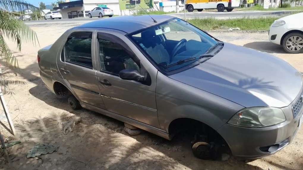 Um carro que havia se envolvido em um acidente de trânsito acabou sendo alvo de furto durante a madrugada e amanheceu sem as quatro rodas no centro de Canelinha, às margens da SC-410.