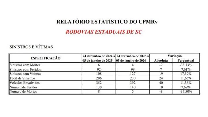 Mesmo com aumento no número de acidentes e pessoas feridas, as rodovias estaduais de Santa Catarina registraram uma queda expressiva nas mortes durante o período das festas de fim de ano, conforme balanço divulgado nesta segunda-feira (5).