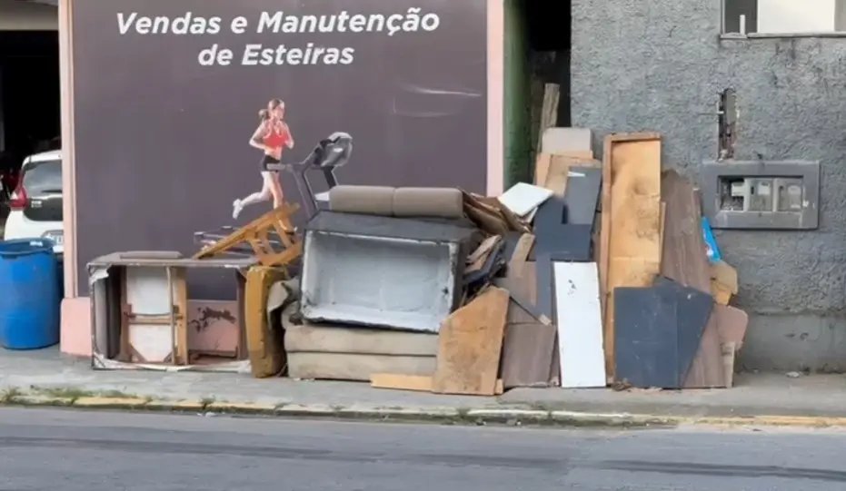 Por meio dos registros, é possível observar vários tipos de materiais, como uma cadeira, parte de um sofá, espuma e diversos pedaços de armários desmontados. O descaso ocupa metade da calçada, prejudicando aqueles que transitam pelo espaço.