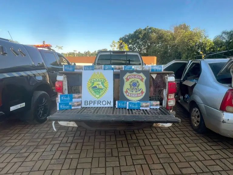 A Polícia Federal apreendeu, na madrugada desta quinta-feira (8), dois veículos carregados com cerca de 40 mil maços de cigarros contrabandeados e prendeu dois homens responsáveis pelo transporte da carga ilícita.