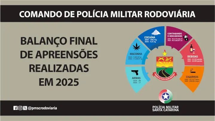 A Polícia Militar de Santa Catarina (PMSC), por meio do Comando de Polícia Militar Rodoviária (CPMRv), apresenta balanço final de todas as apreensões realizadas nas rodovias estaduais de Santa Catarina no anos de 2025. Destaque para o aumento expressivo nas apreensões de maconha, que tiveram uma elevação de 130,51%, em comparação a 2024, e também o montante geral relacionado ao crimes de contrabando de cigarros, que alcançaram a marca dos 528.093 maços apreendidos.