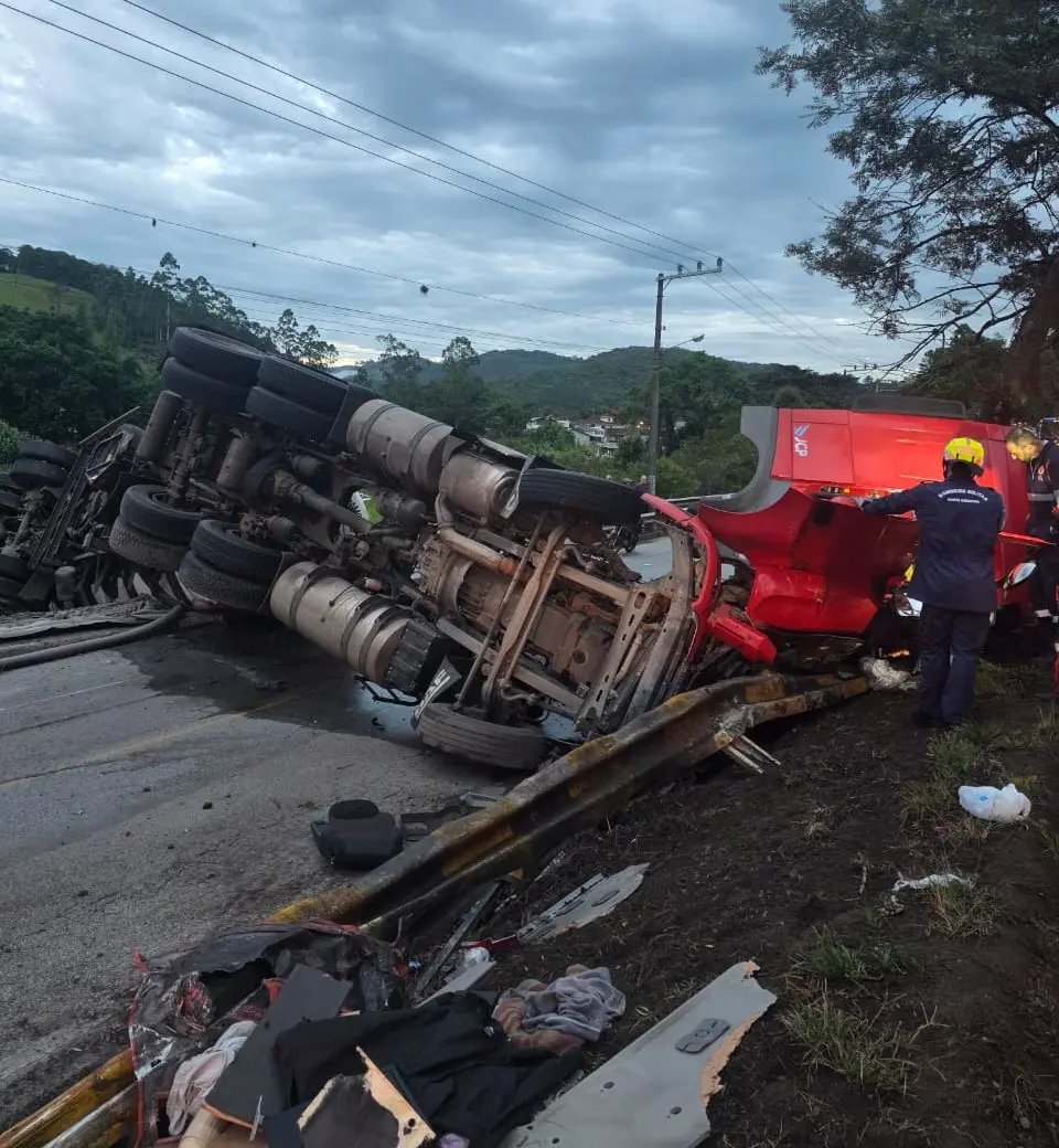 Segundo o Corpo de Bombeiros, a colisão envolveu um caminhão betoneira carregado com cimento e um caminhão que transportava verduras. Após o impacto, os dois veículos tombaram sobre a pista.