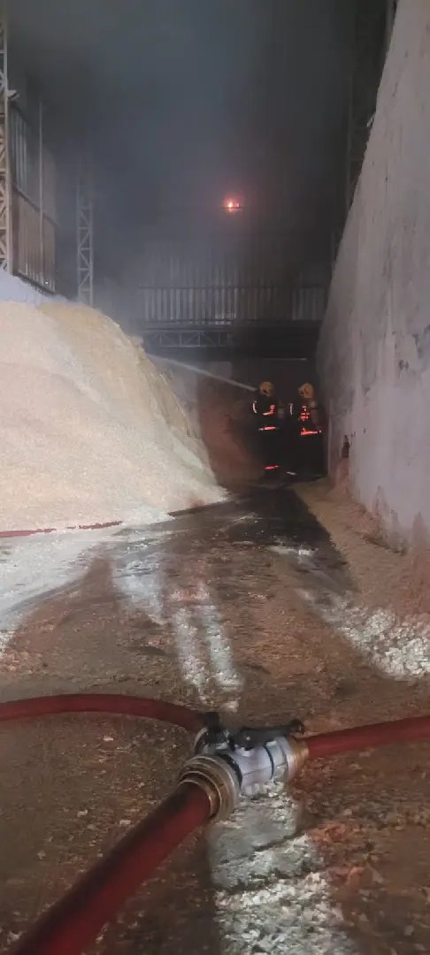 Após o controle, teve início o rescaldo. O material armazenado apresentava alta absorção, o que dificultou o acesso ao ponto mais quente, próximo à boca da esteira. Com apoio de funcionários da empresa, uma empilhadeira com concha foi usada para remover o material e permitir o resfriamento.