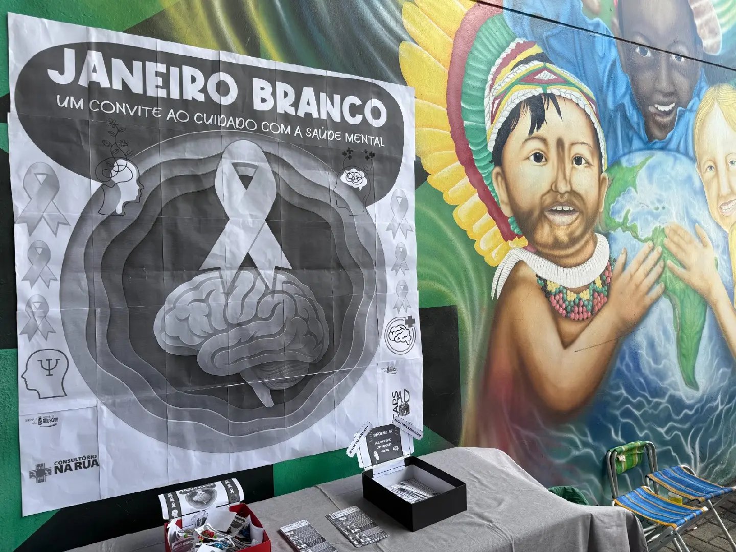 Nesta terça-feira (27), a equipe do Centro de Atenção Psicossocial Álcool e Drogas (CAPS AD), em parceria com o Consultório de Rua, promoveu uma ação na Praça da Cidadania em alusão ao Janeiro Branco, campanha nacional dedicada à conscientização sobre a saúde mental.