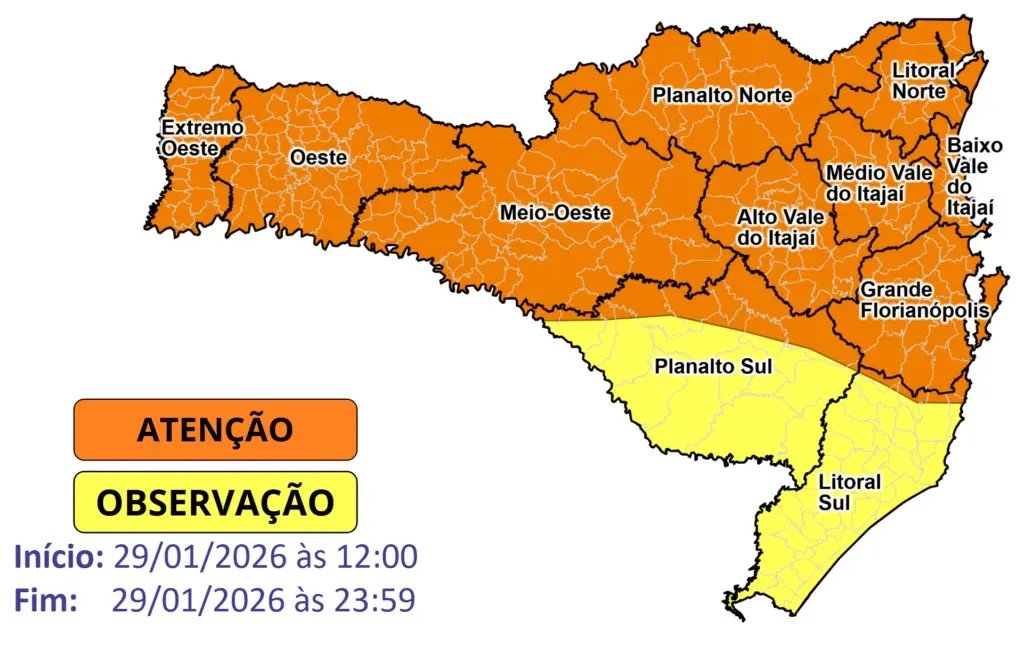 As tempestades podem vir acompanhadas de chuva forte, raios, rajadas de vento e eventual queda de granizo, com maior atenção para o Vale do Itajaí, incluindo Brusque. O risco é moderado a alto para ocorrências como alagamentos, enxurradas pontuais, queda de galhos e árvores, além de danos na rede elétrica.