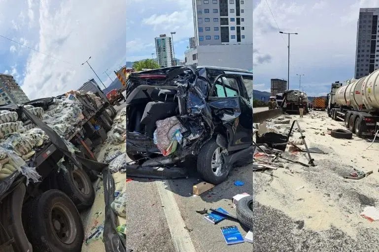Um acidente envolvendo dois caminhões e dois carros deixou duas pessoas feridas na BR-101. A batida foi registrada na tarde deste sábado (31), na altura do km 149, em Itapema.