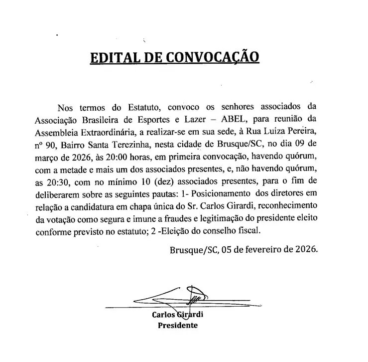 Nos termos do Estatuto, convoco os senhores associados da Associação Brasileira de Esportes e Lazer - ABEL, para reunião da Assembleia Extraordinária, a realizar-se em sua sede, à Rua Luiza Pereira, n° 90, Bairro Santa Terezinha, nesta cidade de Brusque/SC, no dia 09 de março de 2026, às 20:00 horas, em primeira convocação, havendo quórum, com a metade e mais um dos associados presentes, e, não havendo quórum, as 20:30, com no mínimo 10 (dez) associados presentes, para o fim de deliberarem sobre as seguintes pautas: