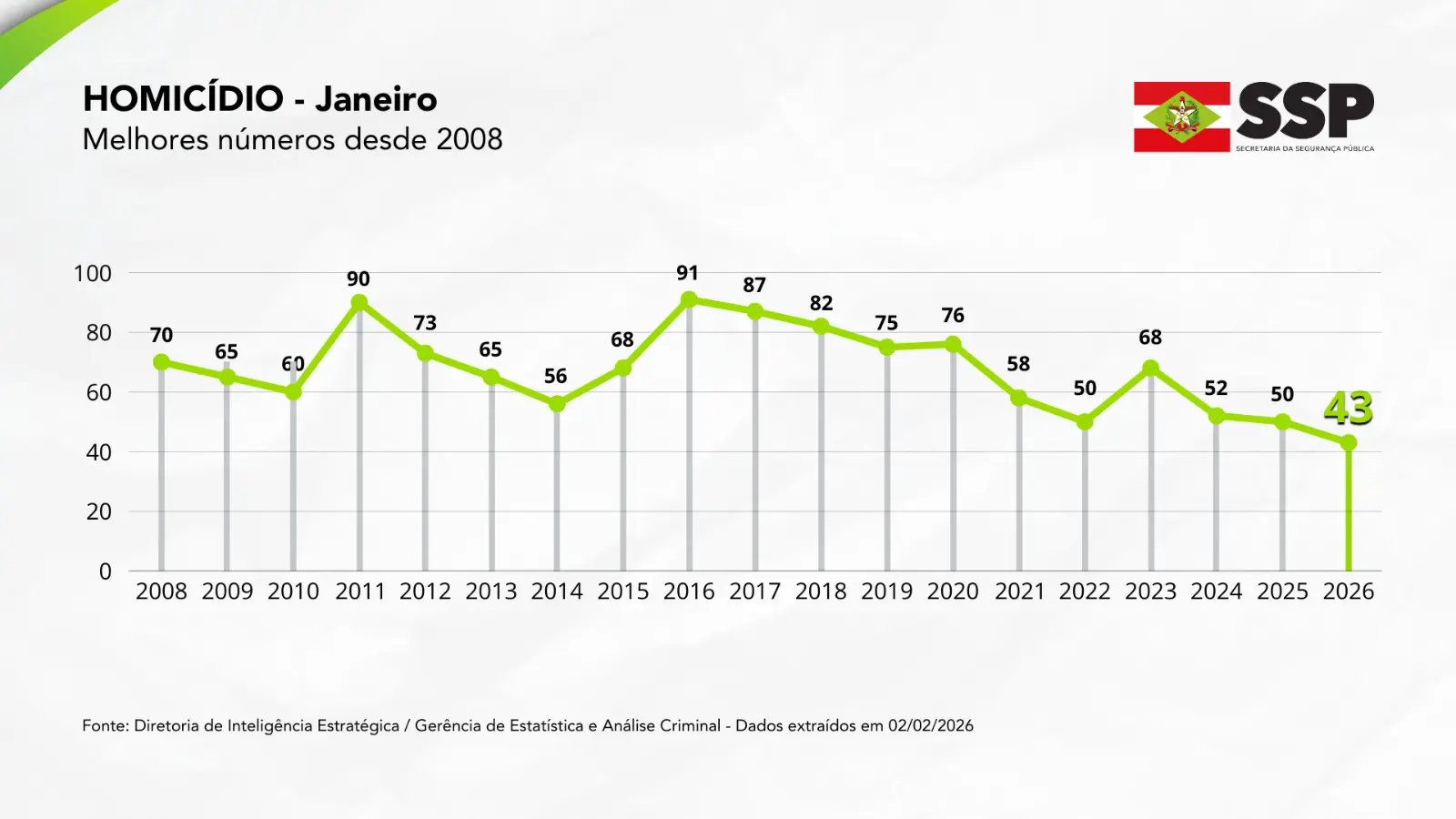 Crimes contra a vida e contra o patrimônio voltam a despencar em Santa Catarina no primeiro mês do ano. O estado encerrou janeiro com recorde na redução de homicídios, alcançando o melhor resultado dos últimos 19 anos, com 43 crimes registrados. O número representa uma redução de 14% em relação ao mesmo período de 2025, quando foram contabilizados 50 homicídios. No comparativo com o mês de janeiro de 2016, período em que Santa Catarina registrou o maior volume de homicídios desde o início da série histórica, em 2008, com 91 casos, a queda chega a 56% em uma década.