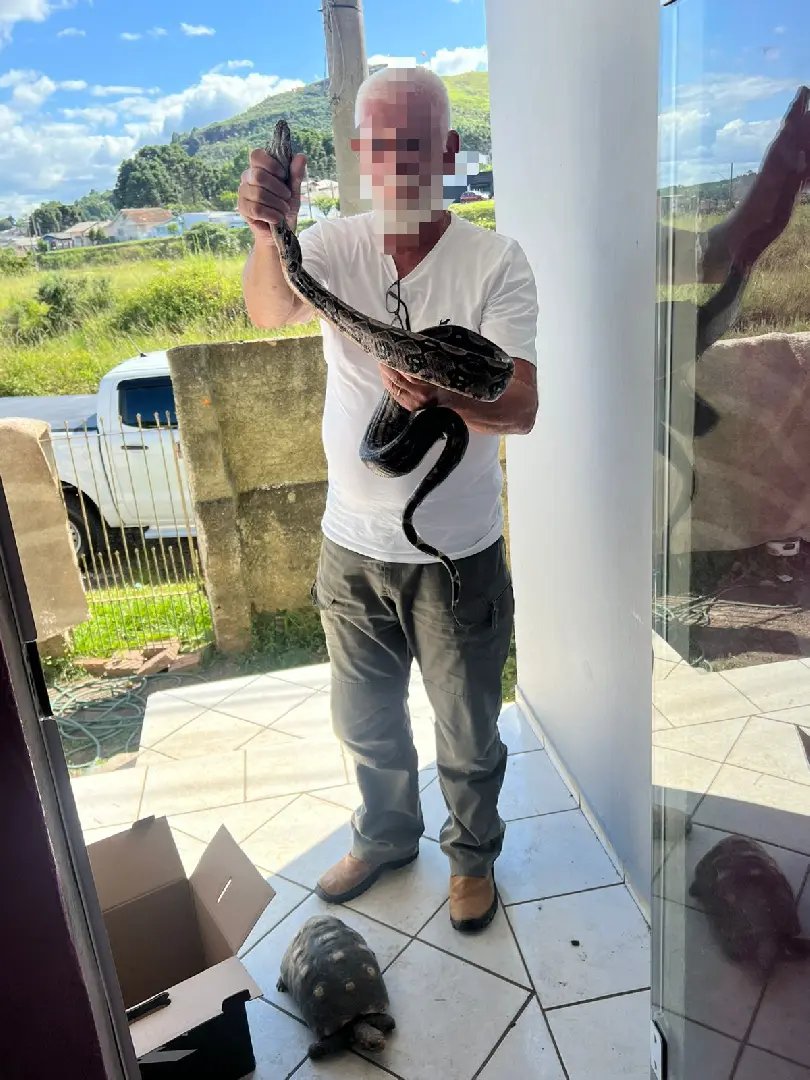 - Em Lages, dois imóveis foram vistoriados, com a apreensão de três jabutis-piranga e duas cobras, sendo uma jiboia e uma corn snake;