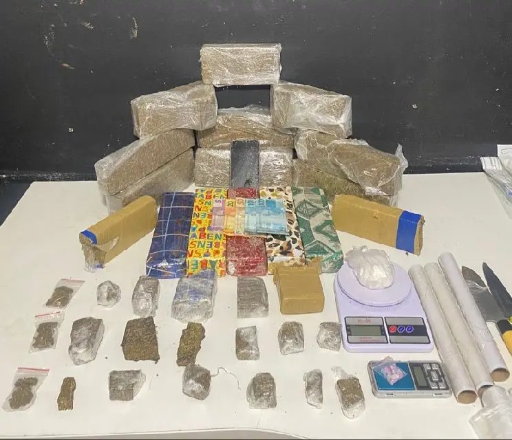 No interior da casa, os policiais apreenderam 12,6 quilos de maconha, duas balanças de precisão, um telefone celular, R$ 275 em dinheiro, dois rolos de material para embalagem e duas facas.