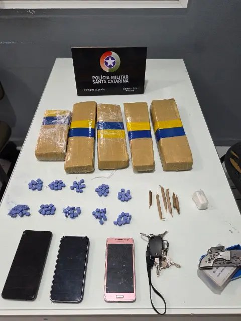 Durante as rondas, os policiais localizaram um veículo com as mesmas características repassadas e realizaram a abordagem. No interior do automóvel, foram encontrados cerca de 100 comprimidos de ecstasy e aproximadamente quatro quilos de maconha.