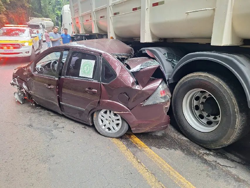 Segundo a Polícia Militar Rodoviária (PMRv), o motorista de um Ford Fiesta, de 81 anos, seguia no sentido Planalto Alegre a Chapecó quando tentou ultrapassar um caminhão e acabou colidindo com outro veículo de carga que vinha no sentido contrário.