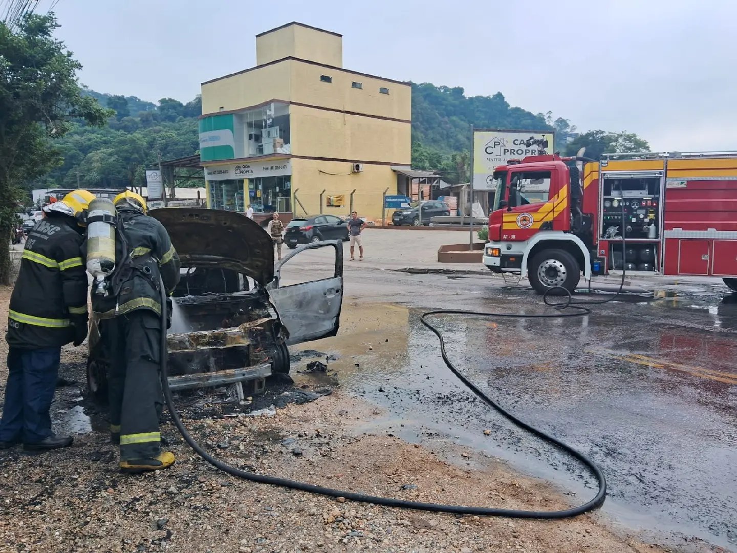 De acordo com a proprietária do carro, Rosa, moradora do bairro Guabiruba, o incêndio começou enquanto ela dirigia. “Quando eu vinha vindo, ele começou a perder força. Eu estacionei e começou a sair fumaça na frente. Mandaram eu sair rápido do carro e começaram a apagar o fogo”, relatou.