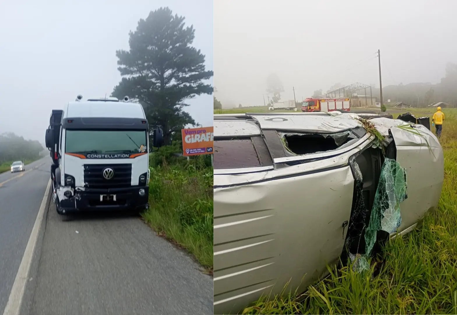 Um carro capotou após ser atingido na traseira por um caminhão e sair da pista. Duas mulheres ficaram feridas e foram encaminhadas ao hospital, no início da manhã desta segunda-feira (16), em Mafra. O acidente ocorreu por volta das 06h37, na BR-280. A colisão envolveu uma Chevrolet S10 e um caminhão Volkswagen Constellation.