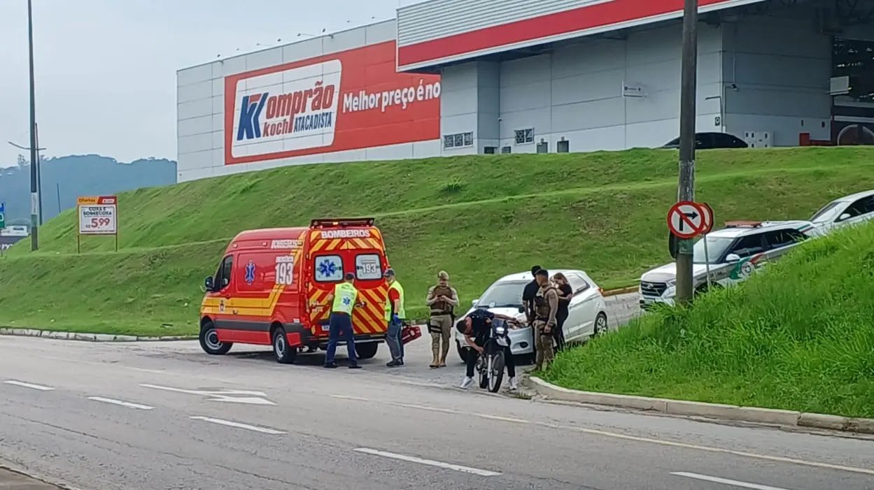 Uma colisão entre carro e moto deixou um motociclista ferido e mobilizou o Corpo de Bombeiros na manhã desta terça-feira (17), em Brusque.