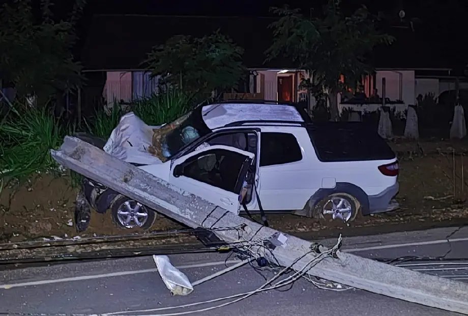 De acordo com informações apuradas no local, a condutora de uma Fiat Strada teria passado mal antes de perder o controle da direção e atingir o poste. Com o impacto, a estrutura quebrou e caiu sobre a via.