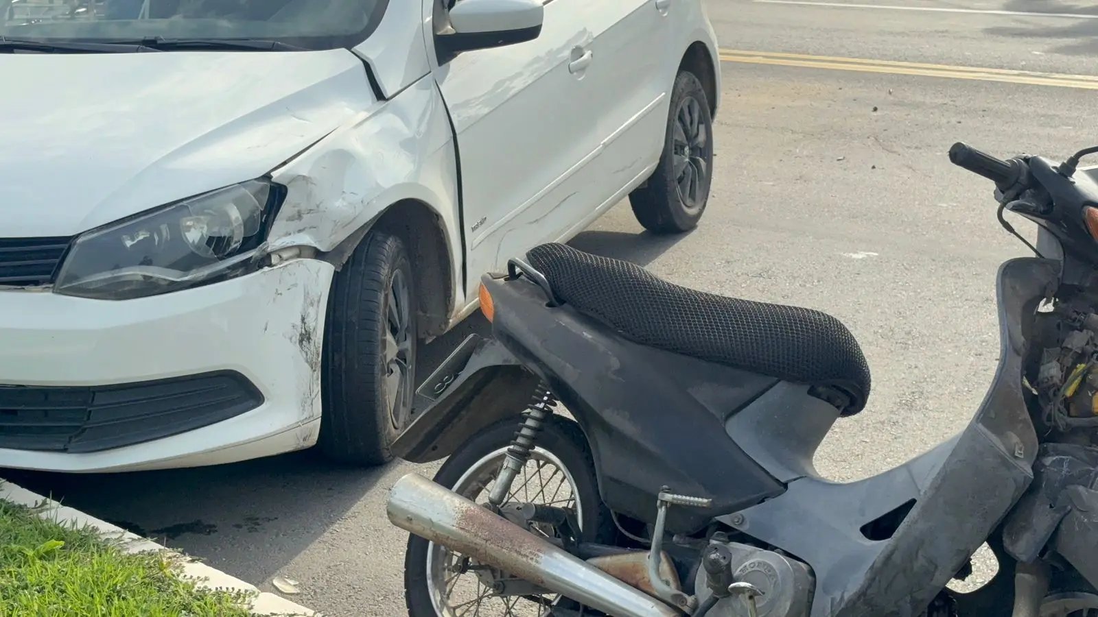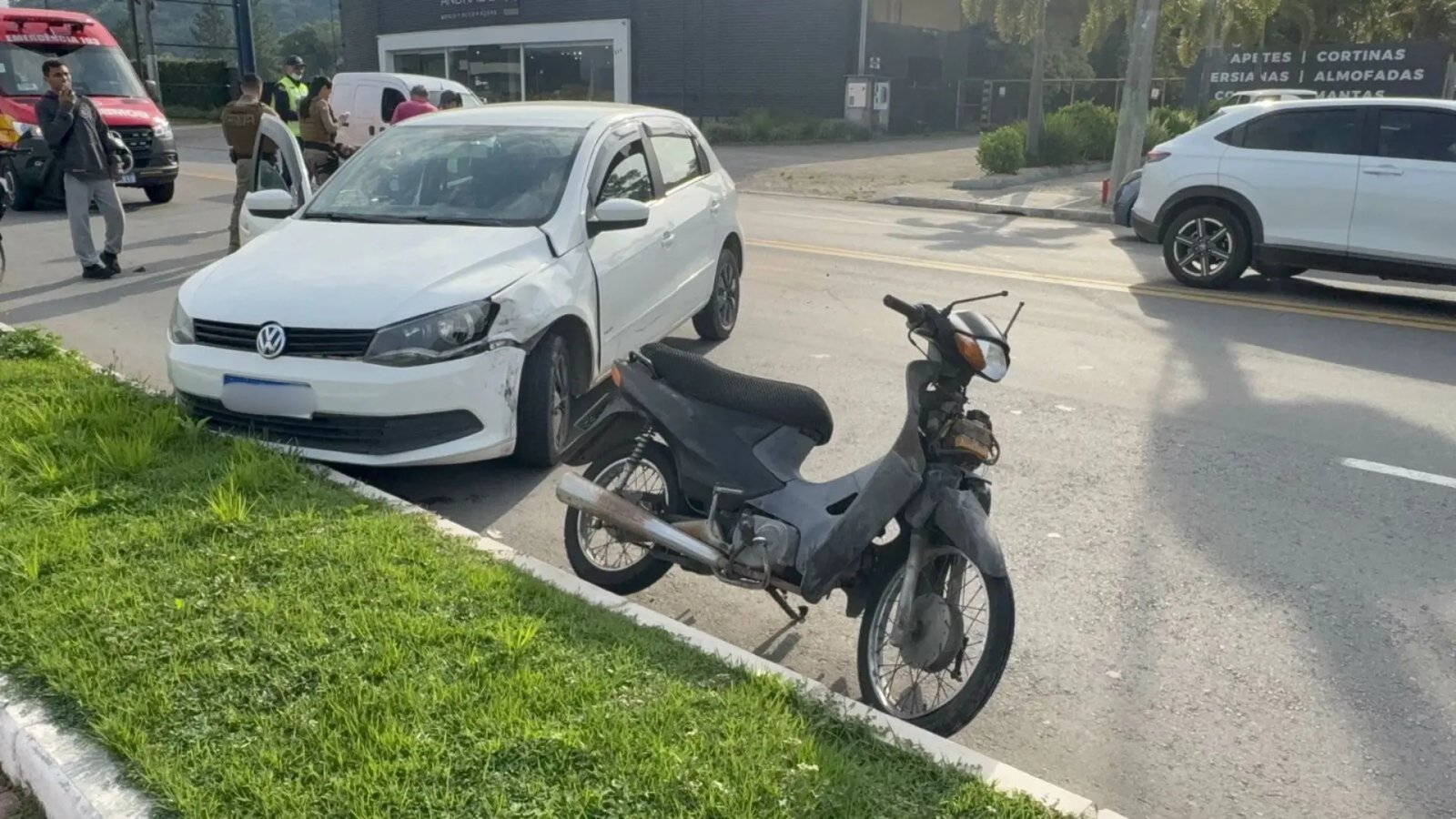 A equipe da Cidade FM esteve no local e acompanhou o atendimento. O Corpo de Bombeiros prestava socorro ao condutor da motocicleta, uma Honda Biz preta, que ficou bastante danificada na parte da frente. A carenagem foi destruída, o paralama quebrou e a roda dianteira entortou, chegando a furar o pneu.