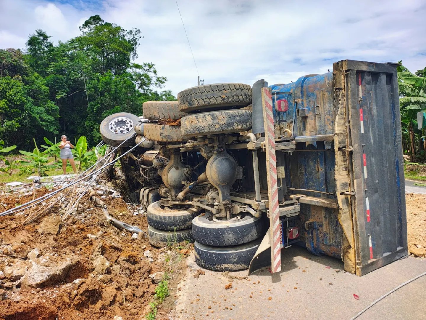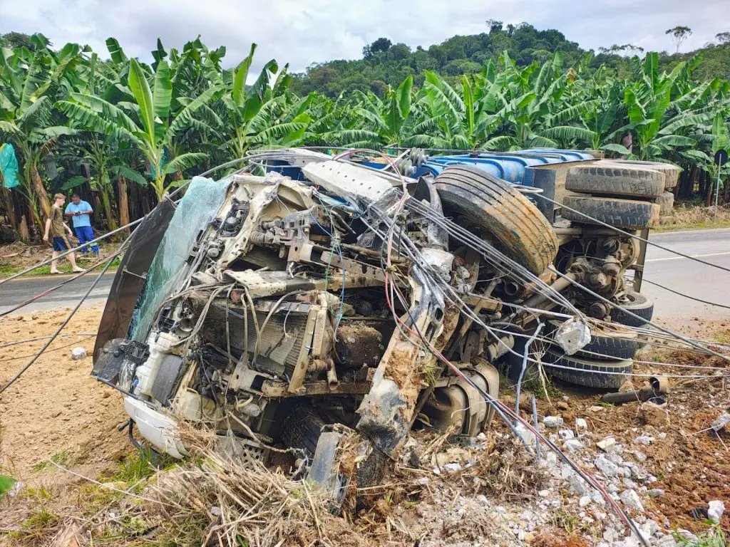 De acordo com informações apuradas no local, o caminhão-caçamba estava carregado com macadame quando o condutor sofreu um mal súbito e perdeu o controle da direção. Com isso, o veículo deixou a pista, capotou e, na sequência, atingiu a estrutura às margens da via.