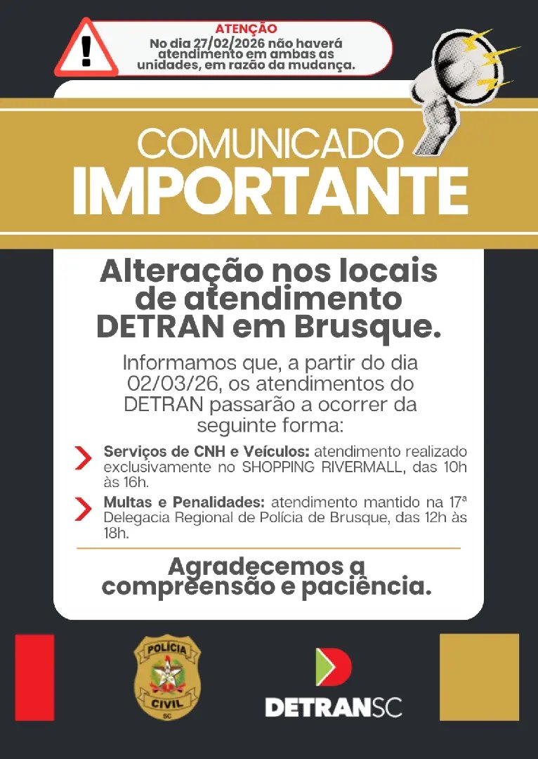 Para viabilizar a mudança de estrutura, o Detran/SC informa que não haverá atendimento em Brusque no dia 27 de fevereiro (sexta-feira), em nenhuma das unidades.