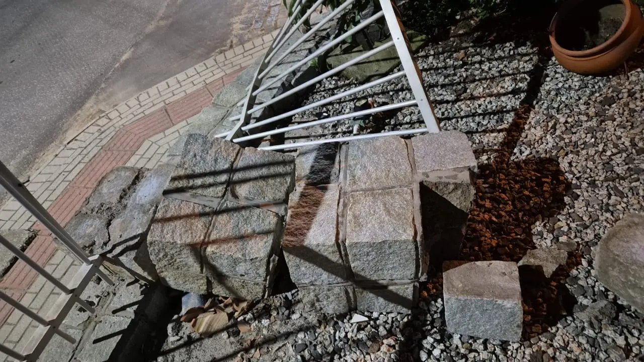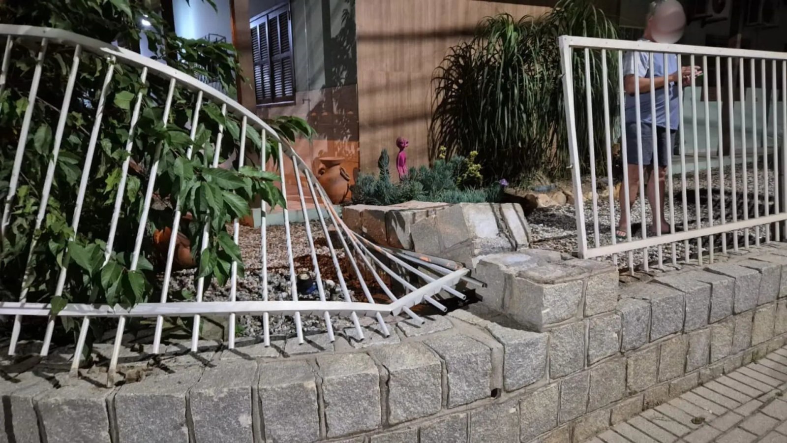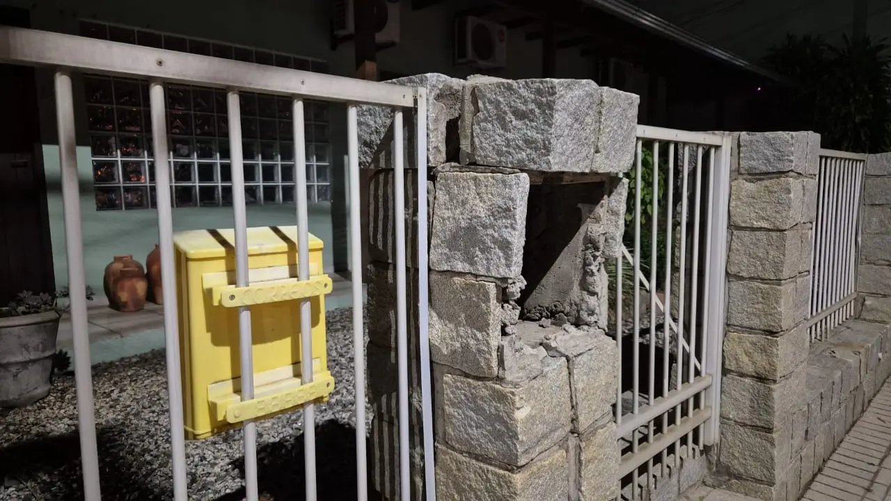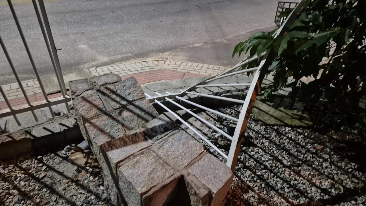 As fotos recebidas pela emissora mostram a dimensão dos danos. A coluna de pedras que sustentava a fachada foi parcialmente destruída, e a grade metálica ficou entortada para dentro da propriedade, evidenciando a força do impacto.