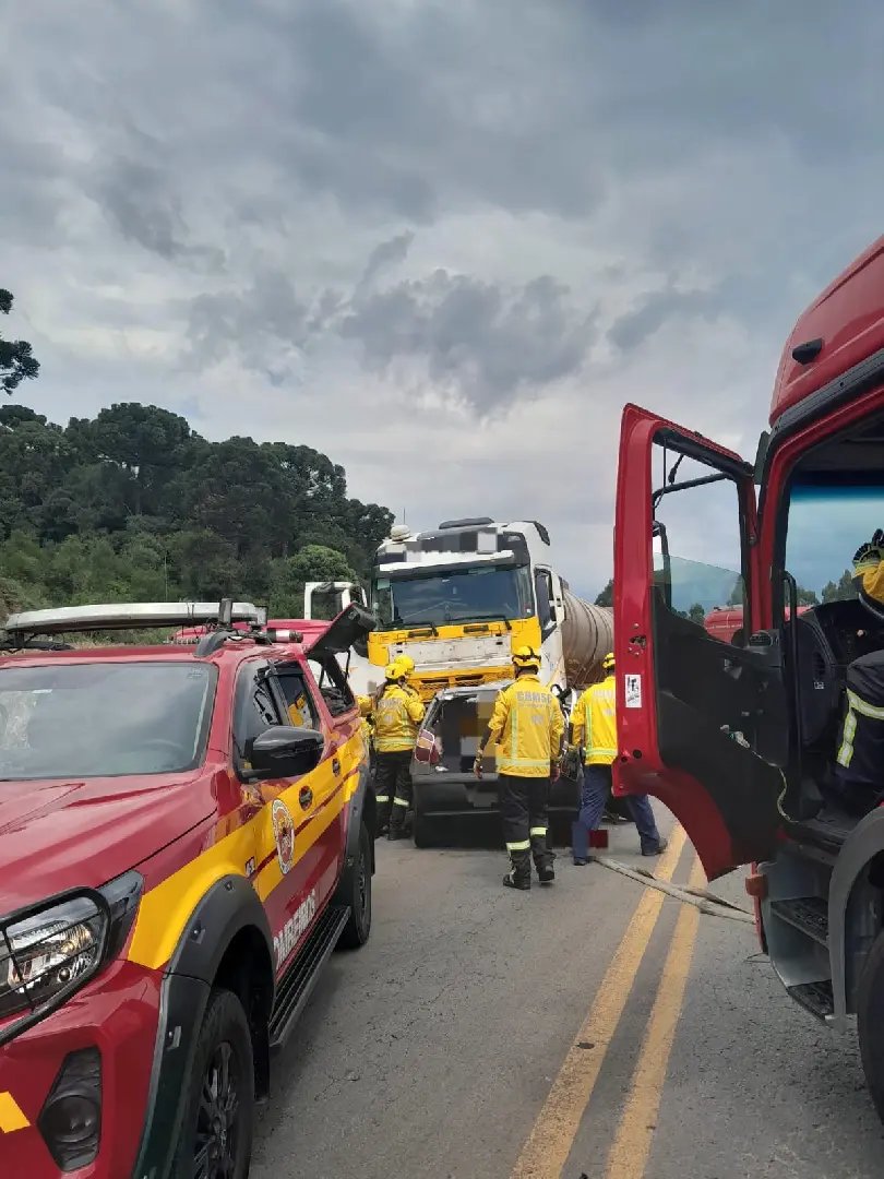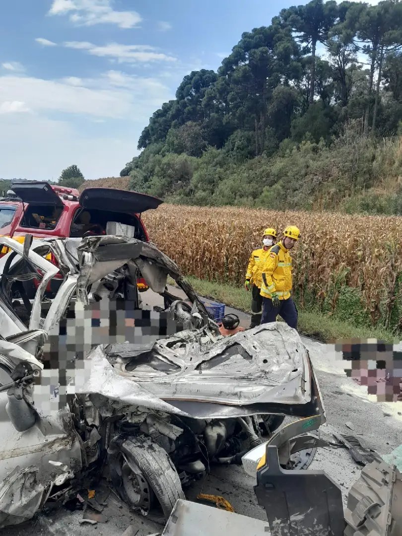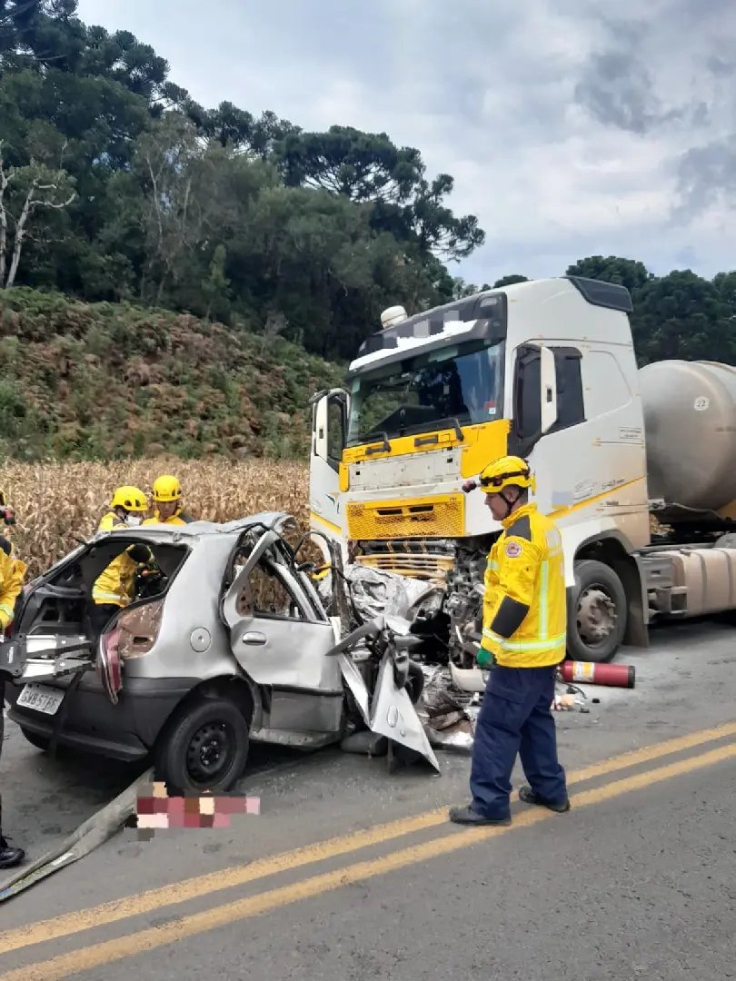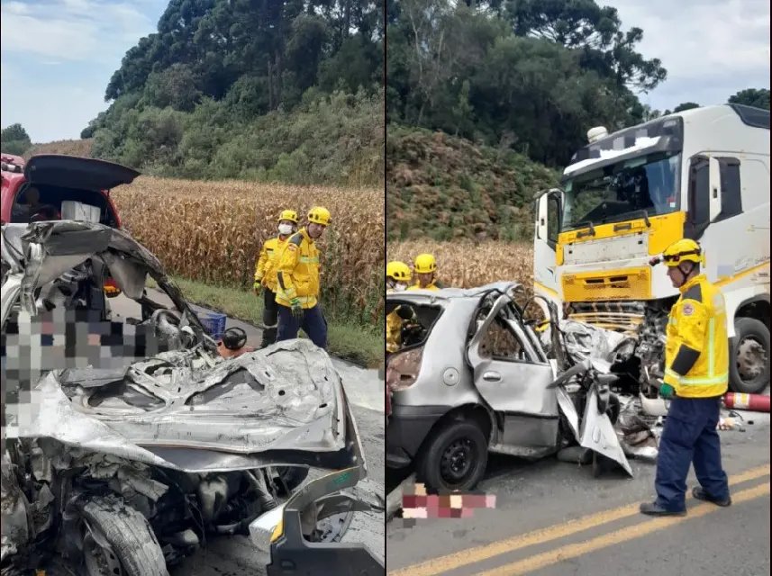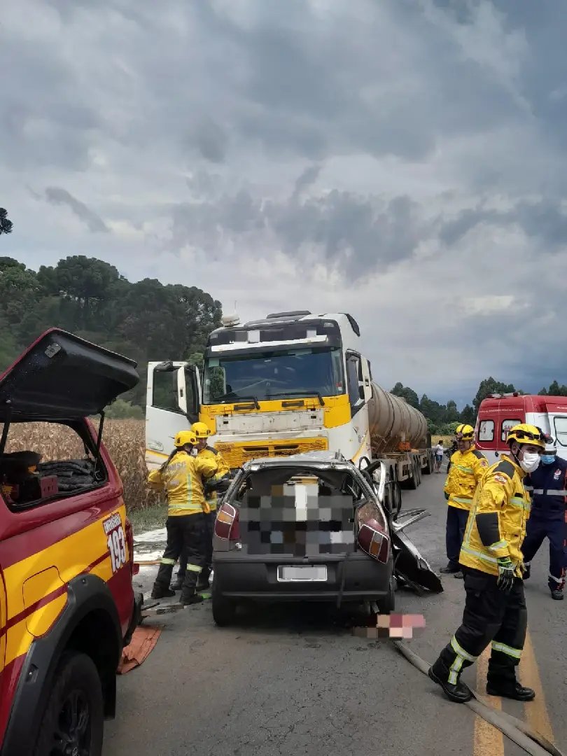 De acordo com o Corpo de Bombeiros, no local, as equipes encontraram uma carreta bitrem que havia colidido frontalmente com um Fiat Palio.