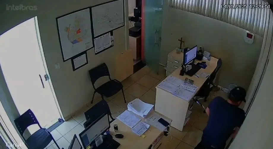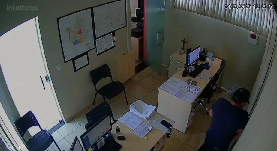 Após ter acesso ao dinheiro, o suspeito coloca o valor dentro da cueca e deixa a sala de forma tranquila. Conforme a polícia, aproximadamente R$ 7 mil foram levados durante a ação.