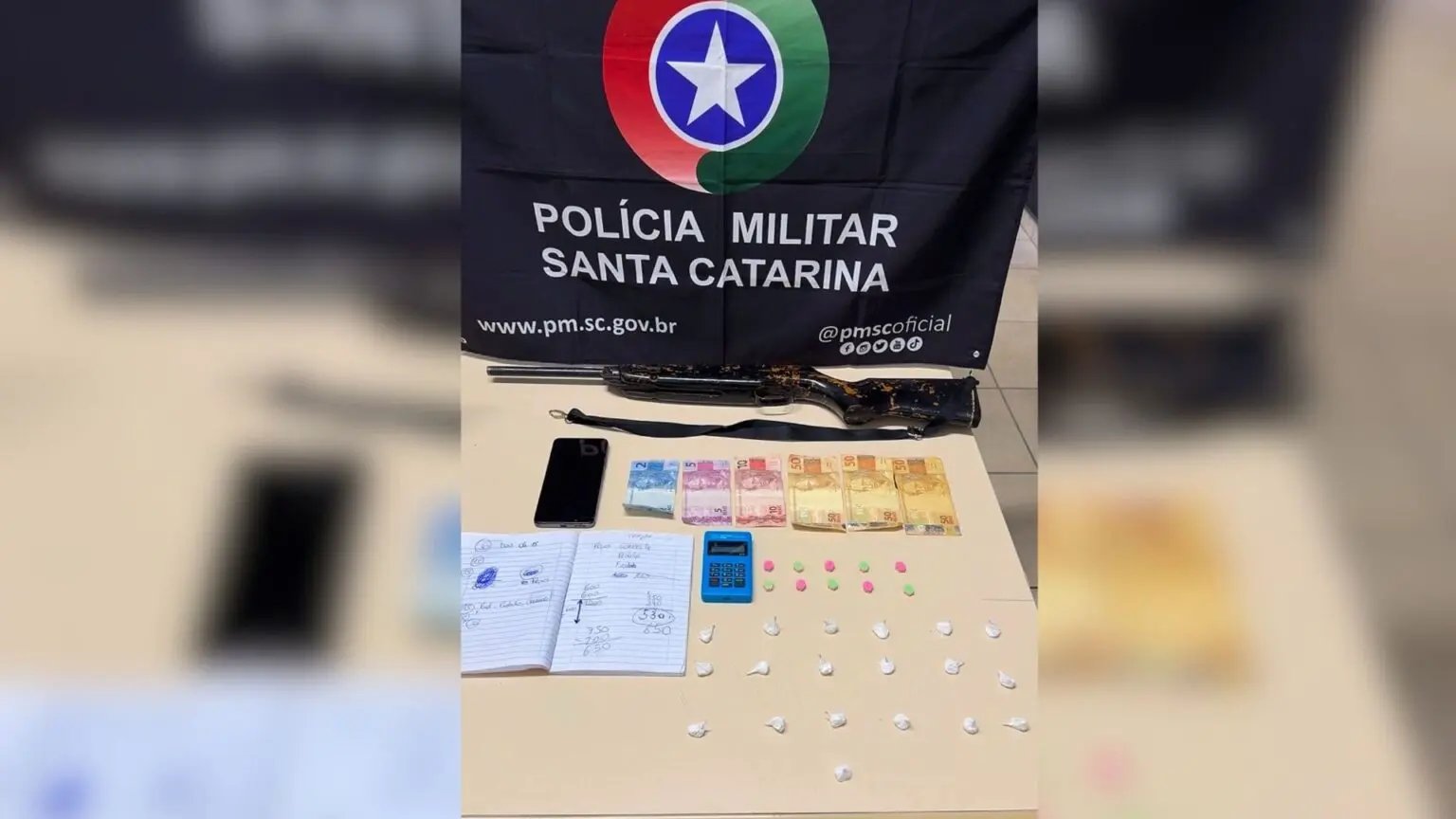 Na busca pessoal, foram localizadas porções de substância análoga à cocaína, já fracionadas e prontas para comercialização, além de dinheiro em espécie e um aparelho celular. O suspeito também portava uma espingarda de pressão.