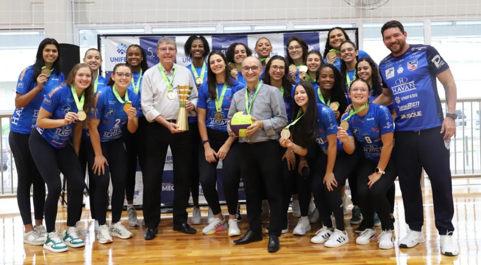 Após dois acessos à elite do vôlei nacional, como vice-campeãs da Superliga B, o título inédito foi conquistado neste domingo (29). A final foi histórica, com vitória por 3 sets a 2 sobre o Pinheiros, tradicional clube paulista, na Arena Brusque, lotada de torcedores. As parciais foram: 25-20, 18-25, 25-19, 19-25 e 15-12.