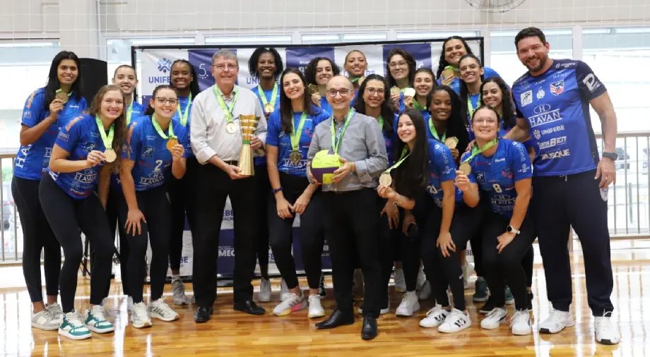 A UNIFEBE recebeu, na última quarta-feira (1.º), uma visita especial da ABEL Moda Vôlei, time brusquense que conquistou o título da Superliga B de vôlei feminino neste domingo (29). Elenco, comissão técnica e diretoria se encontraram com colaboradores, com o vice-reitor da instituição, professor Sérgio Rubens Fantini, e com o pró-reitor de Graduação, professor Sidnei Gripa, no ginásio do Complexo Esportivo Ruth Mosimann Hoffmann.