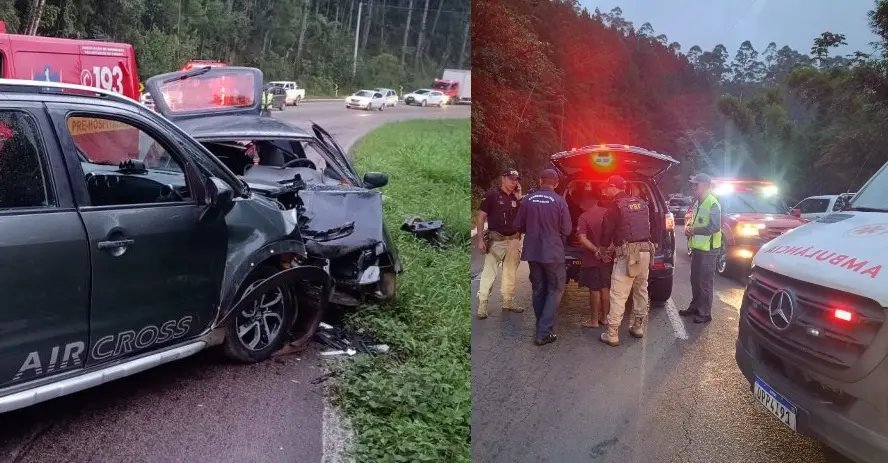 A colisão frontal aconteceu por volta das 17h, quando o carro, com placas de São Bento do Sul, seguia no sentido São Bento do Sul–Corupá, invadiu a pista contrária e bateu de frente em um Citroën Aircross, de Campo Alegre.
