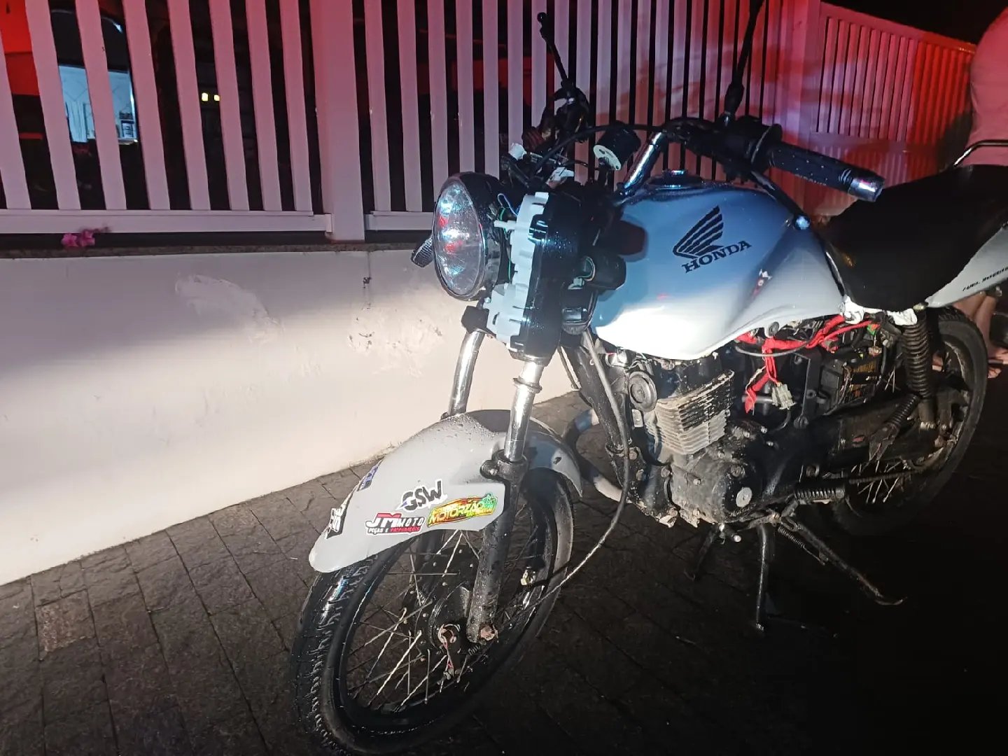 Já a moto sofreu danos na parte frontal, indicando a força da batida.
