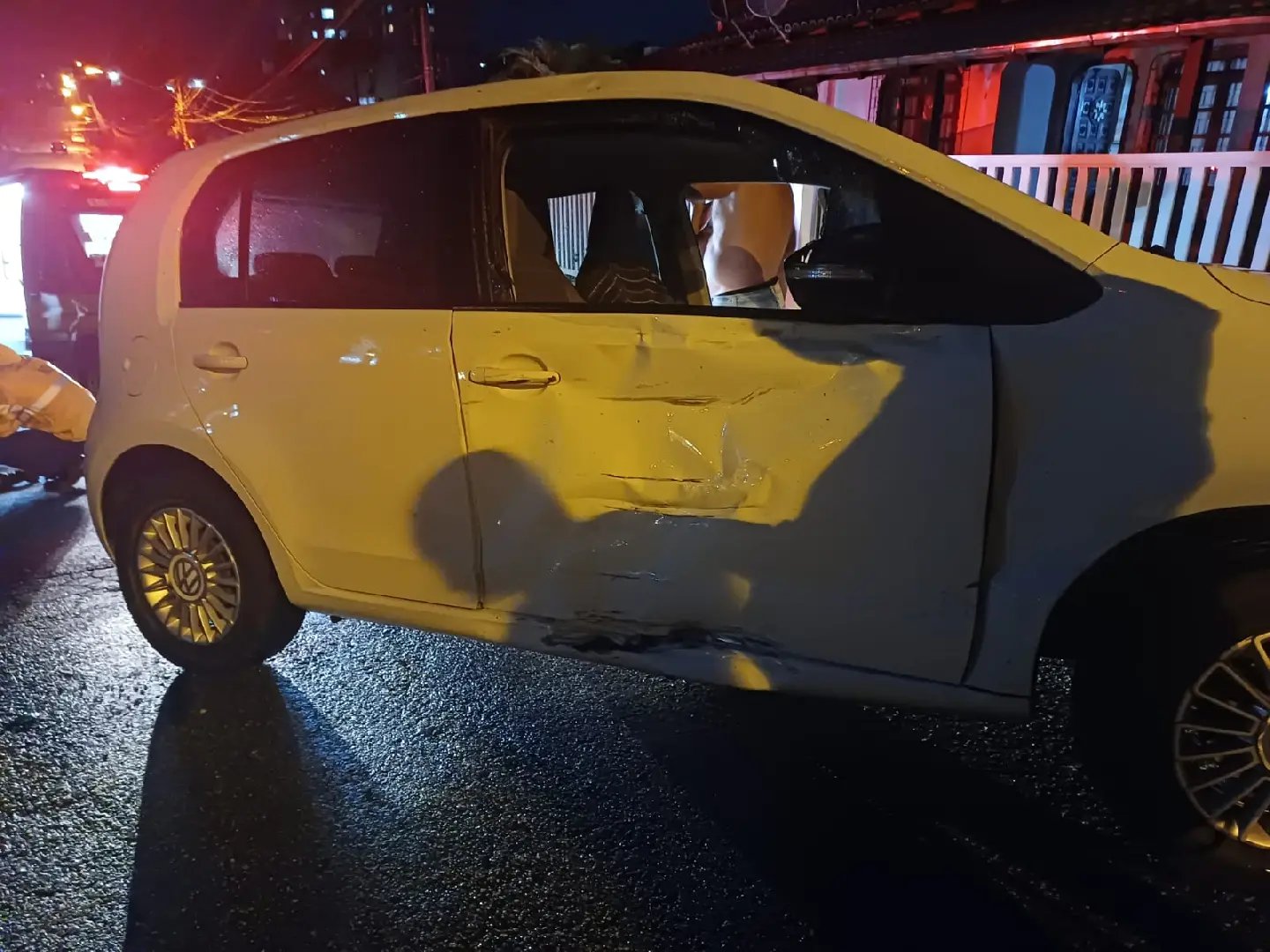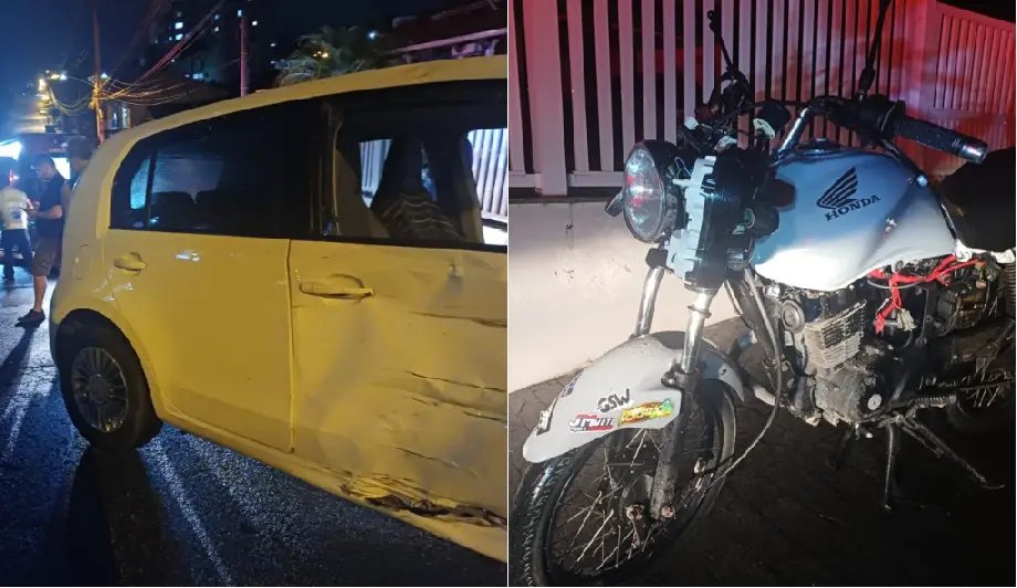 O acidente foi do tipo lateral e envolveu um VW Up e uma motocicleta CG. Com o impacto, o carro teve a porta amassada e o vidro do passageiro quebrado.