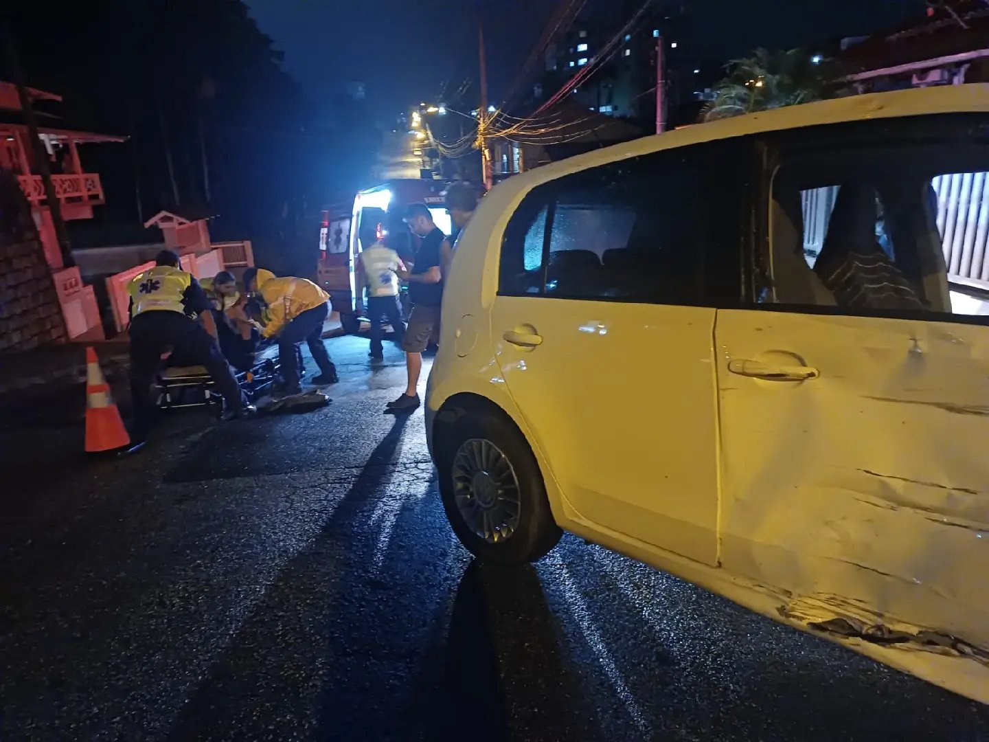 Segundo informações apuradas pela Rádio Cidade com uma pessoa que passava pelo local, o motociclista apresentava várias escoriações pelo corpo e um corte lacerante no joelho esquerdo.