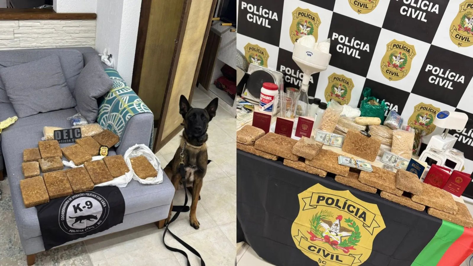 No local, os policiais encontraram uma estrutura completa de laboratório, com produtos químicos controlados, como ácidos sulfúrico e clorídrico, além de equipamentos como centrífuga, provetas e béqueres. Também foram apreendidas folhas de coca, grande quantidade de cocaína já processada e dinheiro em espécie, em diferentes moedas, totalizando cerca de R$ 200 mil.