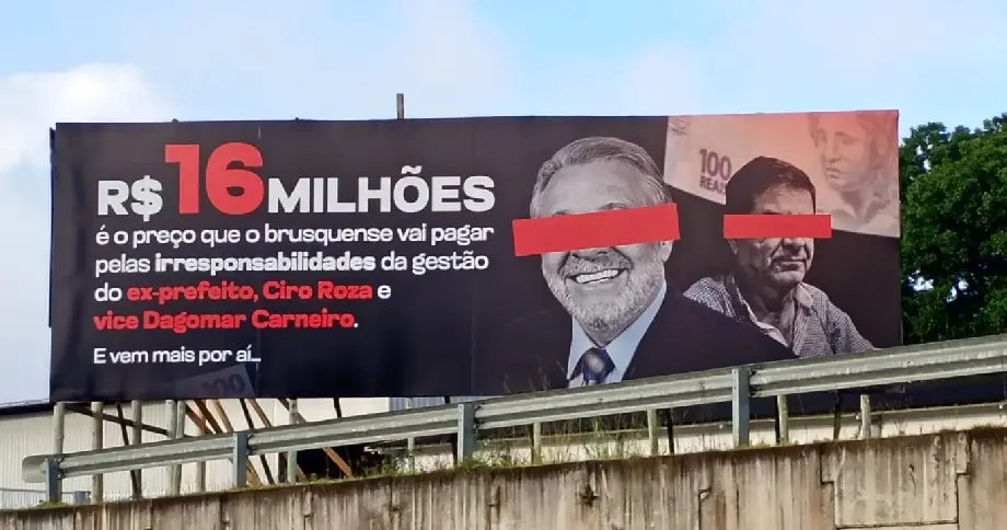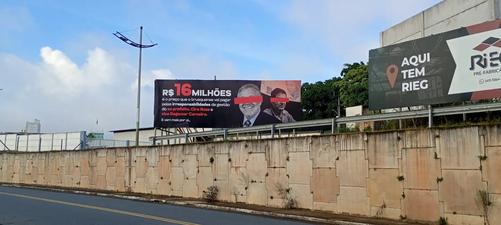 “R$ 16 milhões é o preço que o brusquense vai pagar pelas irresponsabilidades da gestão do ex-prefeito Ciro Roza e vice Dagomar Carneiro. E vem mais por aí...”. A frase, exibida em um outdoor instalado às margens da Avenida Governador Luiz Henrique da Silveira (Beira Rio), no bairro São Luiz, em Brusque, tem chamado a atenção de quem passa pelo local.